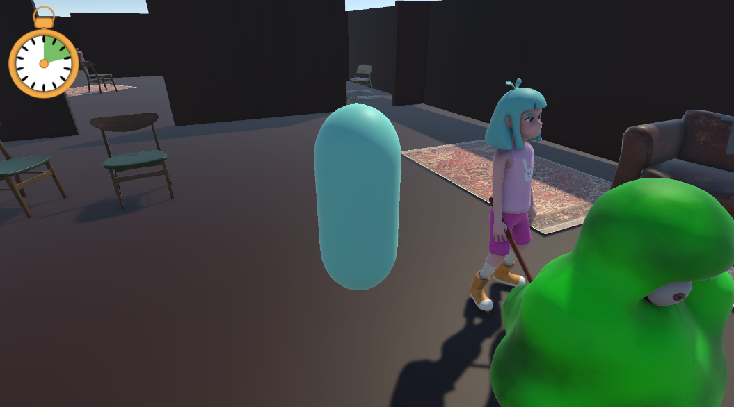 You find yourself in a mansion you must escape, but a strange creature is stalking you inside. You have two forms: a physical one, which you can use to clean and unblock passages, and a spectral one, which allows you to pass through walls, remain invisible, and distract the monster by making noise.